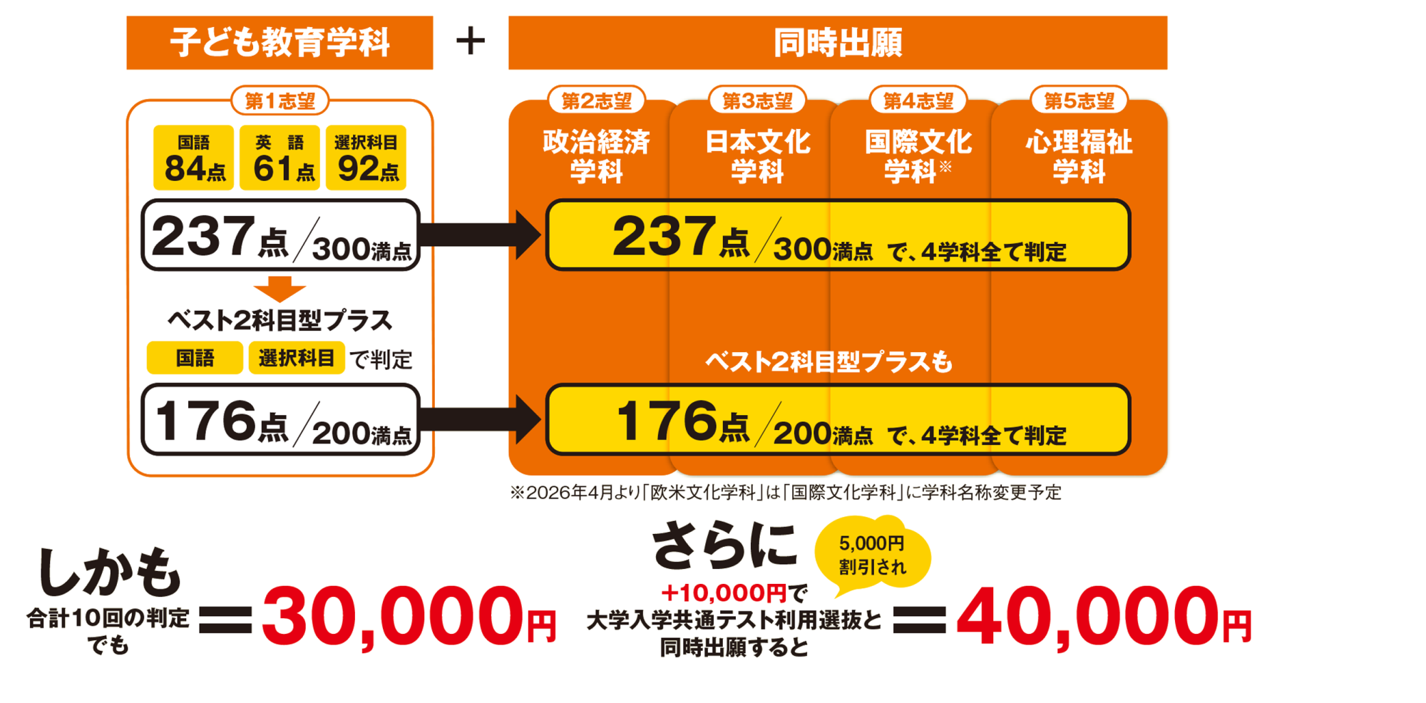 一度の試験の点数で、5つの学料の合判定が受けられるので合格のチャンスが5倍、「ベスト2科目型」をプラスすれば10倍になります!