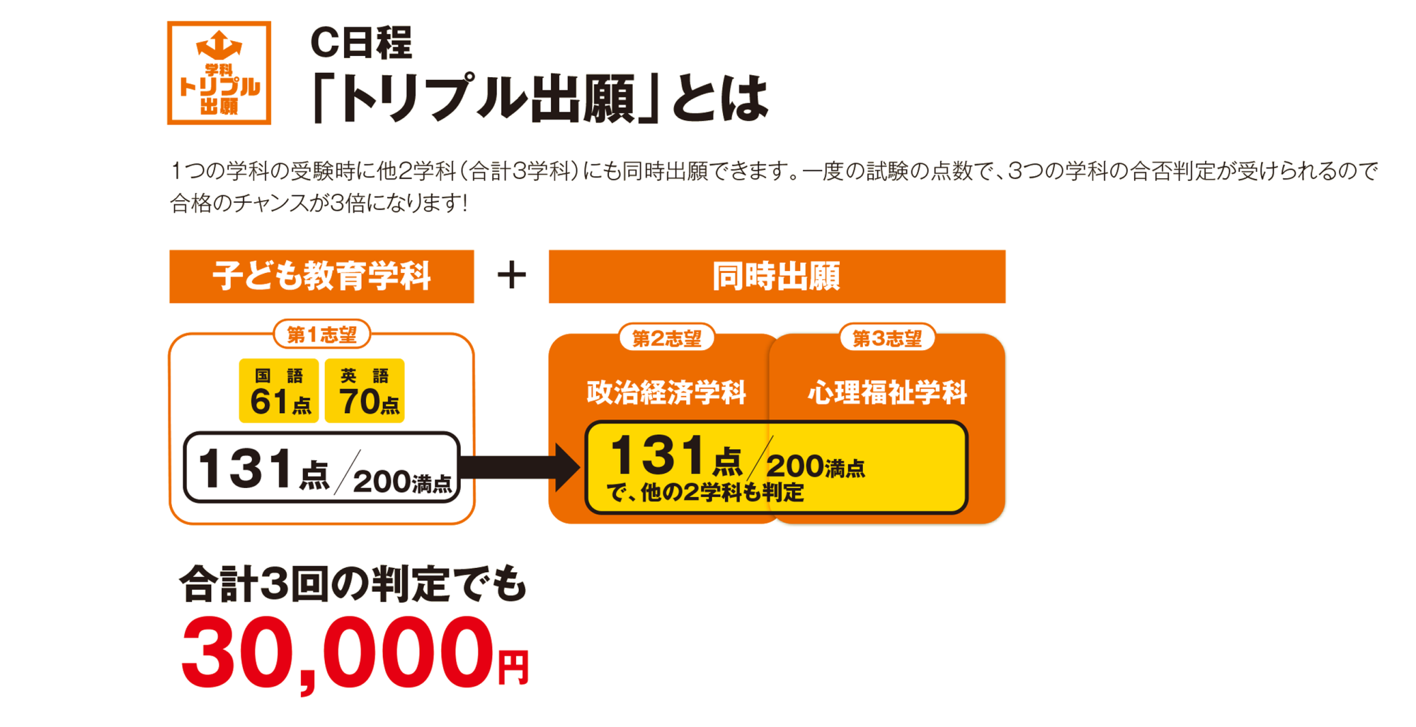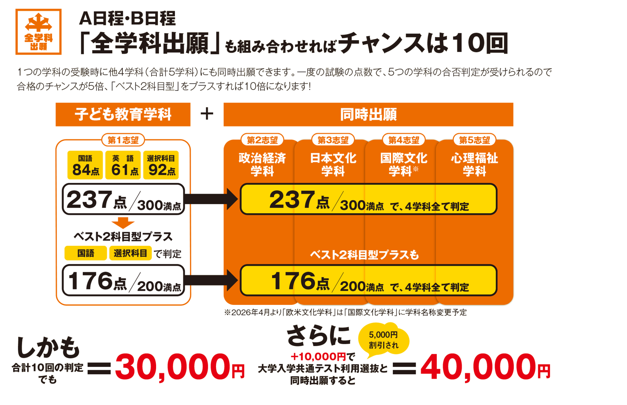 複数回受験される方は、総合型選抜、学校推薦型選抜、一般選抜を問わず、2回目以降の検定料が “10,000円割引”になります。(2回目以降実質検定料が20,000円)