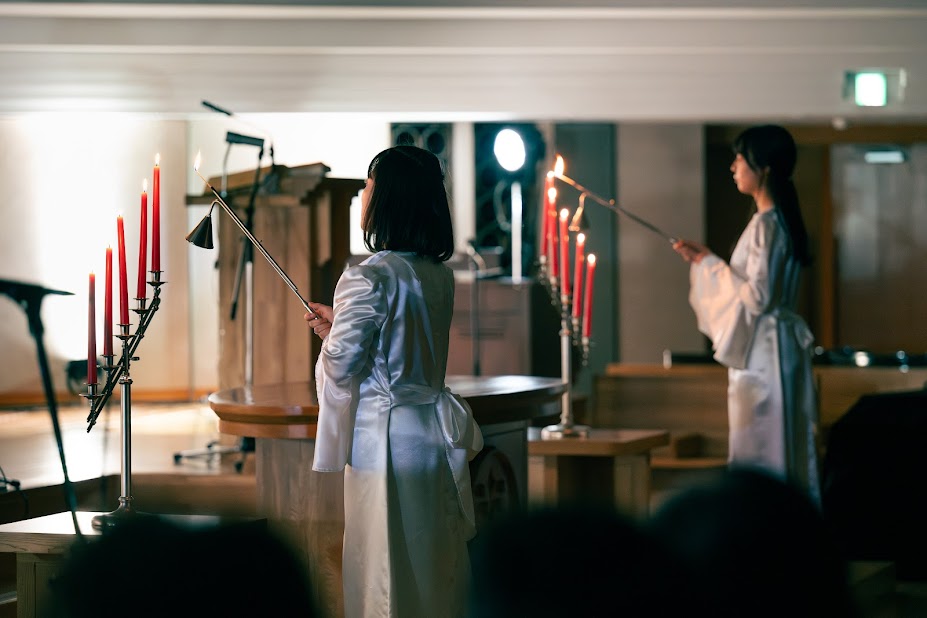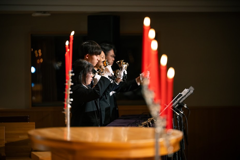 キリスト教の礼拝形式で行われ、聖歌隊やハンドベルの賛美の中、天使に扮した学生がろうそくに光を灯し、クリスマスの始まりを祝います。