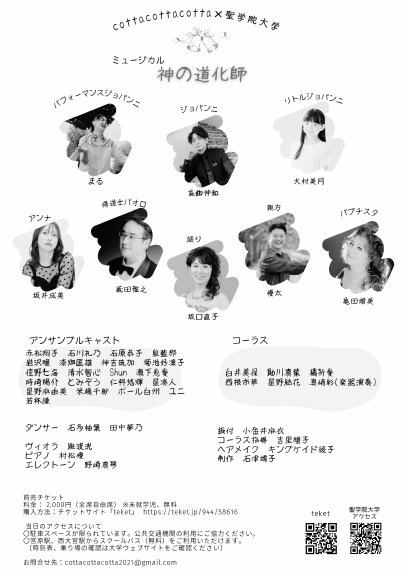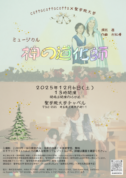 このミュージカルは埼玉県大宮・宮原地域で芸術活動を展開し、高い評価を得ている演劇・音楽集団cotta cotta cotta(コッタ コッタ コッタ)と聖学院大学の連携事業です。(2025年度聖学院⼤学地域連携活動助成⾦活動)