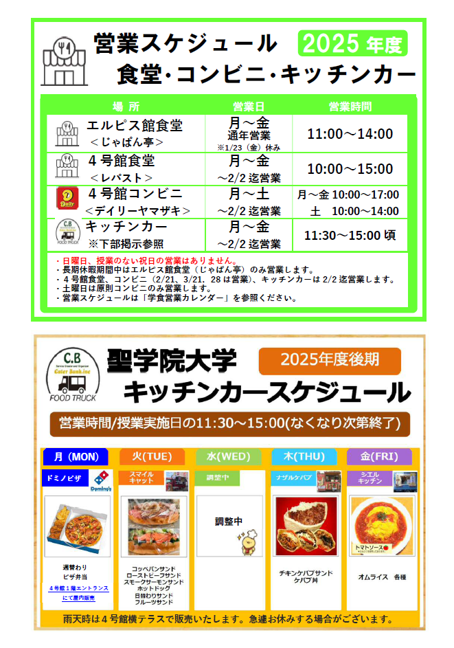 ※年間の営業スケジュール【学食営業カレンダー】を参照ください。