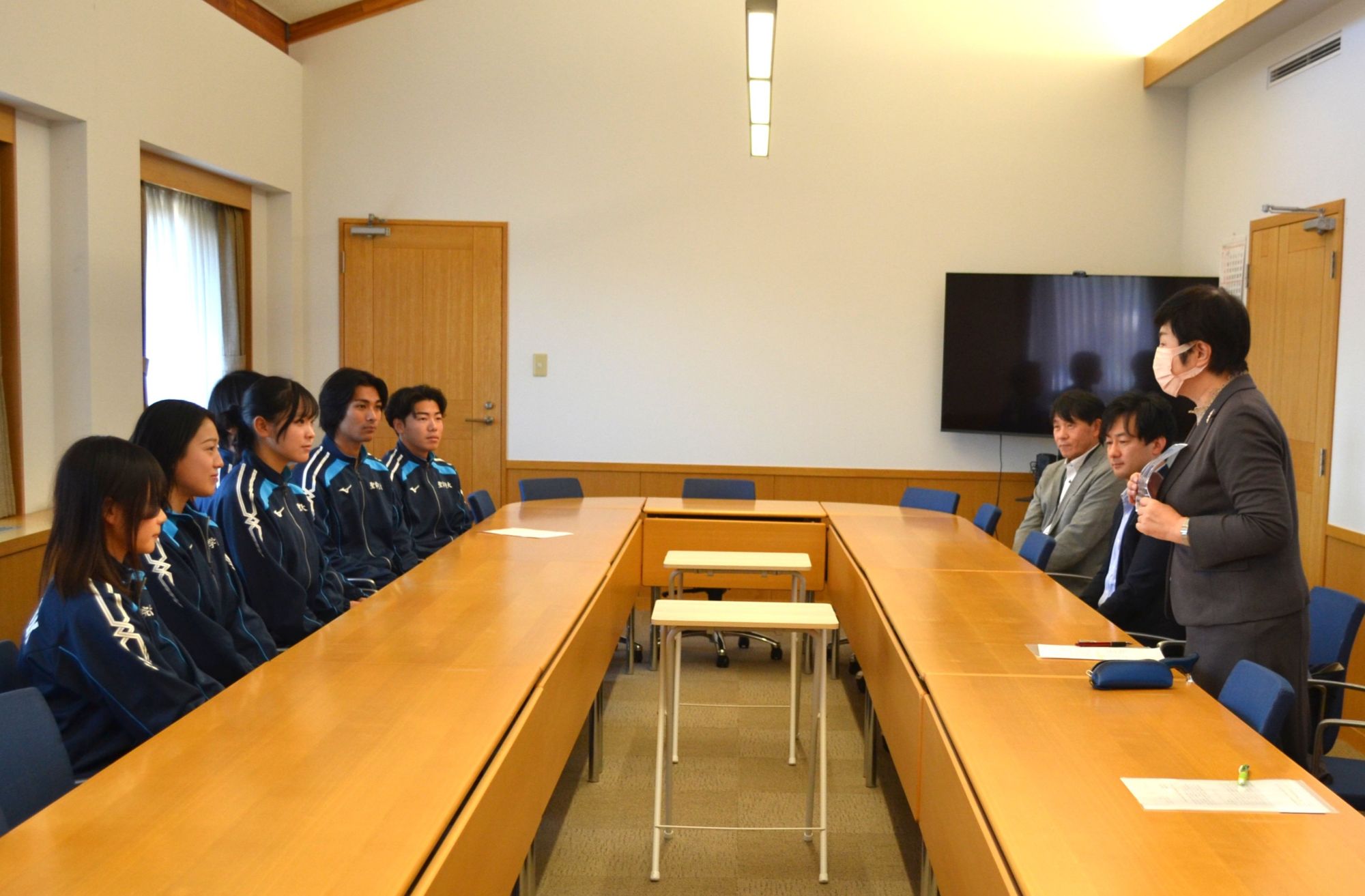 2025年度に上位入賞した陸上部員6名が12月10日(水)に小池茂子学長、松永直人学生生活部長を表敬訪問し今年の活躍を報告し来季の更なる飛躍を誓いました。来シーズンも陸上競技部の活躍にご期待ください。