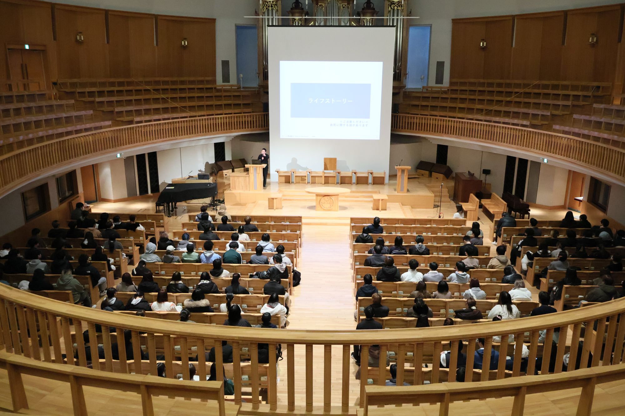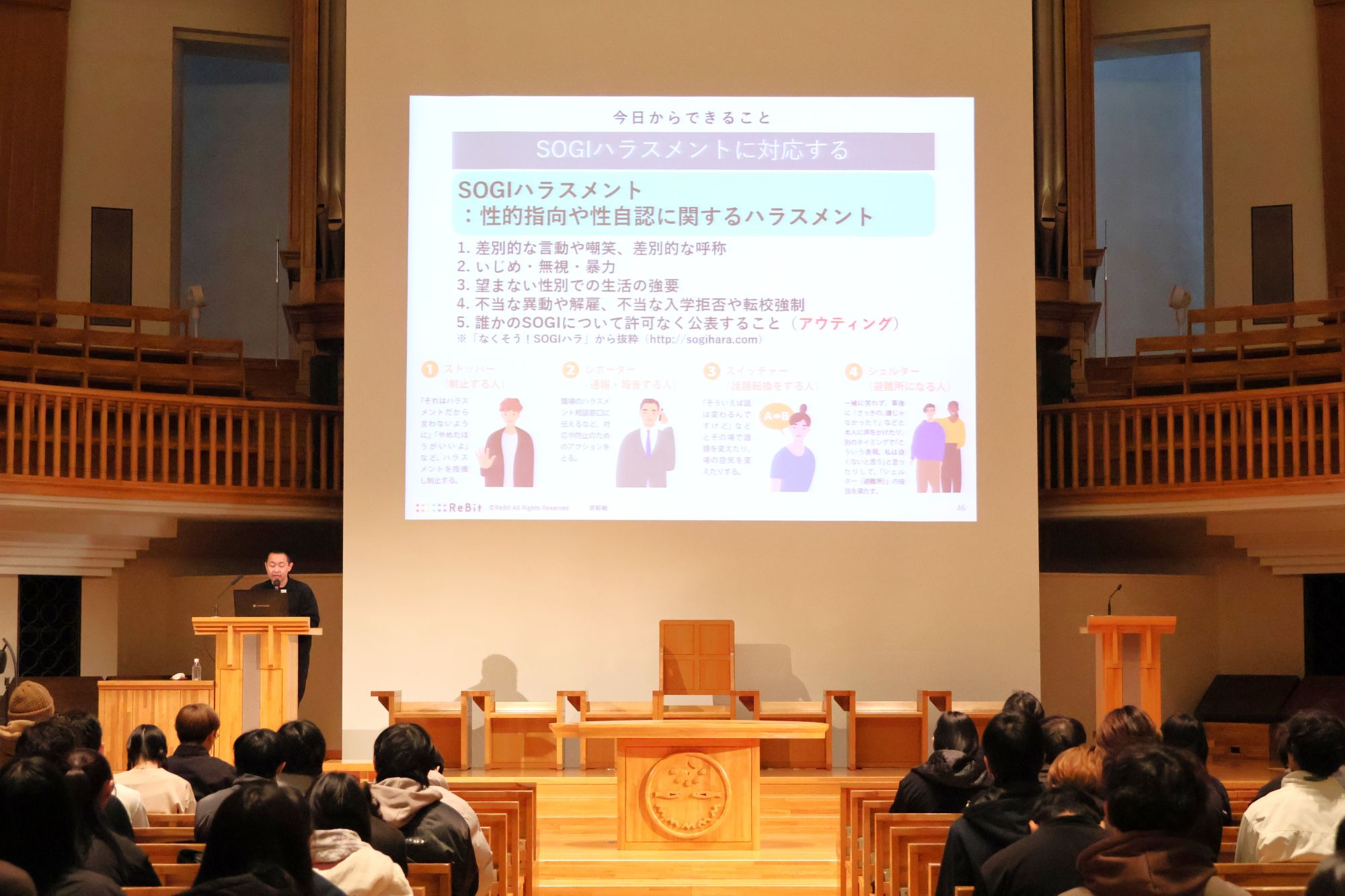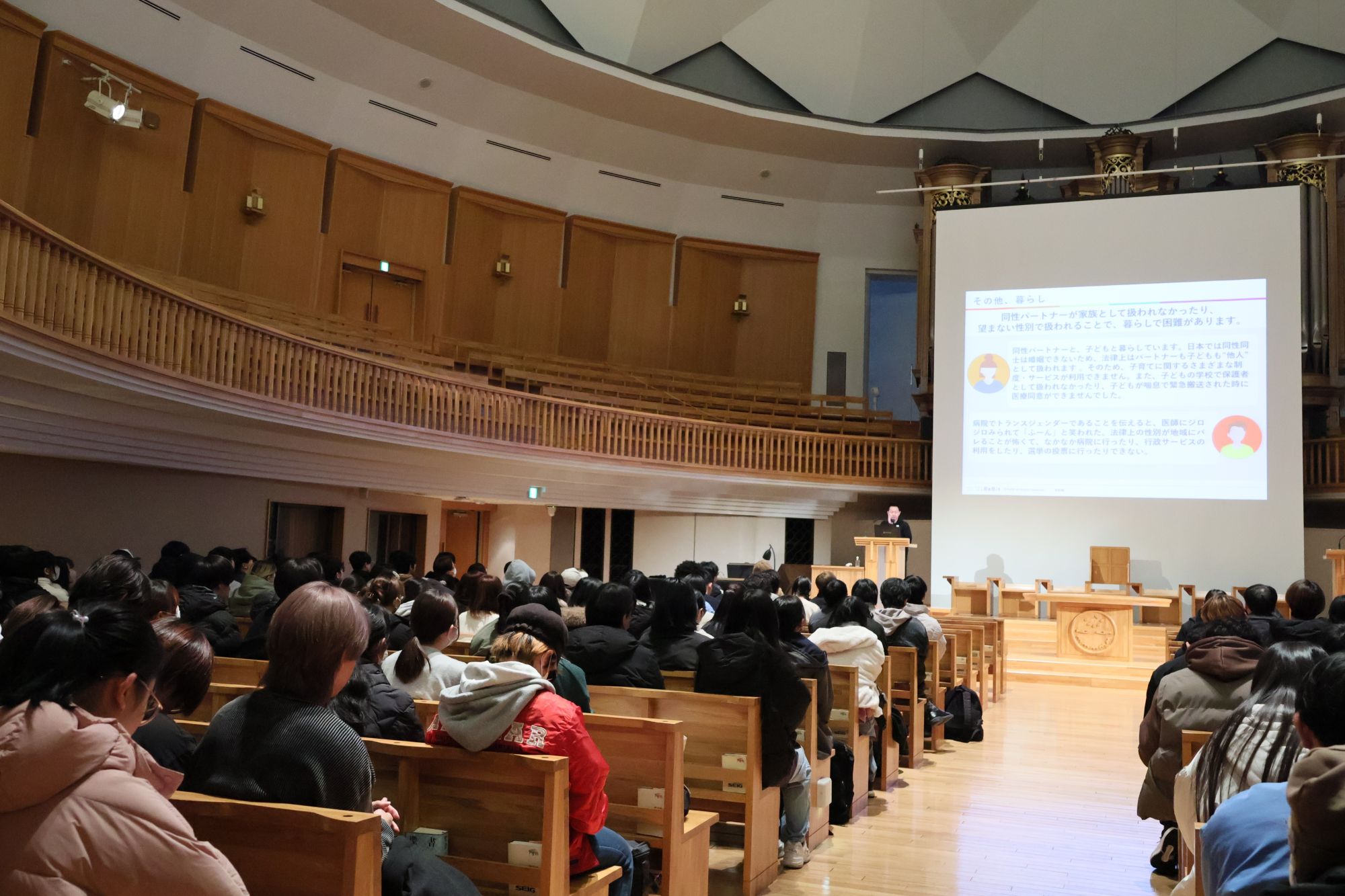 2026年1月7日(水)、心理福祉学科では講演会「多様性を大切にできる人と社会に」を開催しました。講師は、心理福祉学部の田村綾子教授が会長を務める日本精神保健福祉士協会の会員で、LGBTQ支援の第一線で活躍する認定NPO法人ReBit代表理事・藥師 実芳(やくし みか)氏。チャペルという特別な空間で語られたのは、「知ること」から始まる支援のかたちでした。これから社会の担い手となる全ての学生、そして未来のソーシャルワーカーを目指す学生たちは、この学びをどう受け止め、どんな成長を見せたのでしょか。本学ならではの実践的な学びをレポートします。