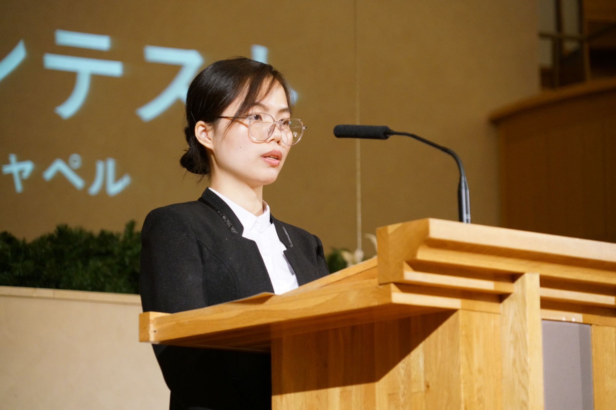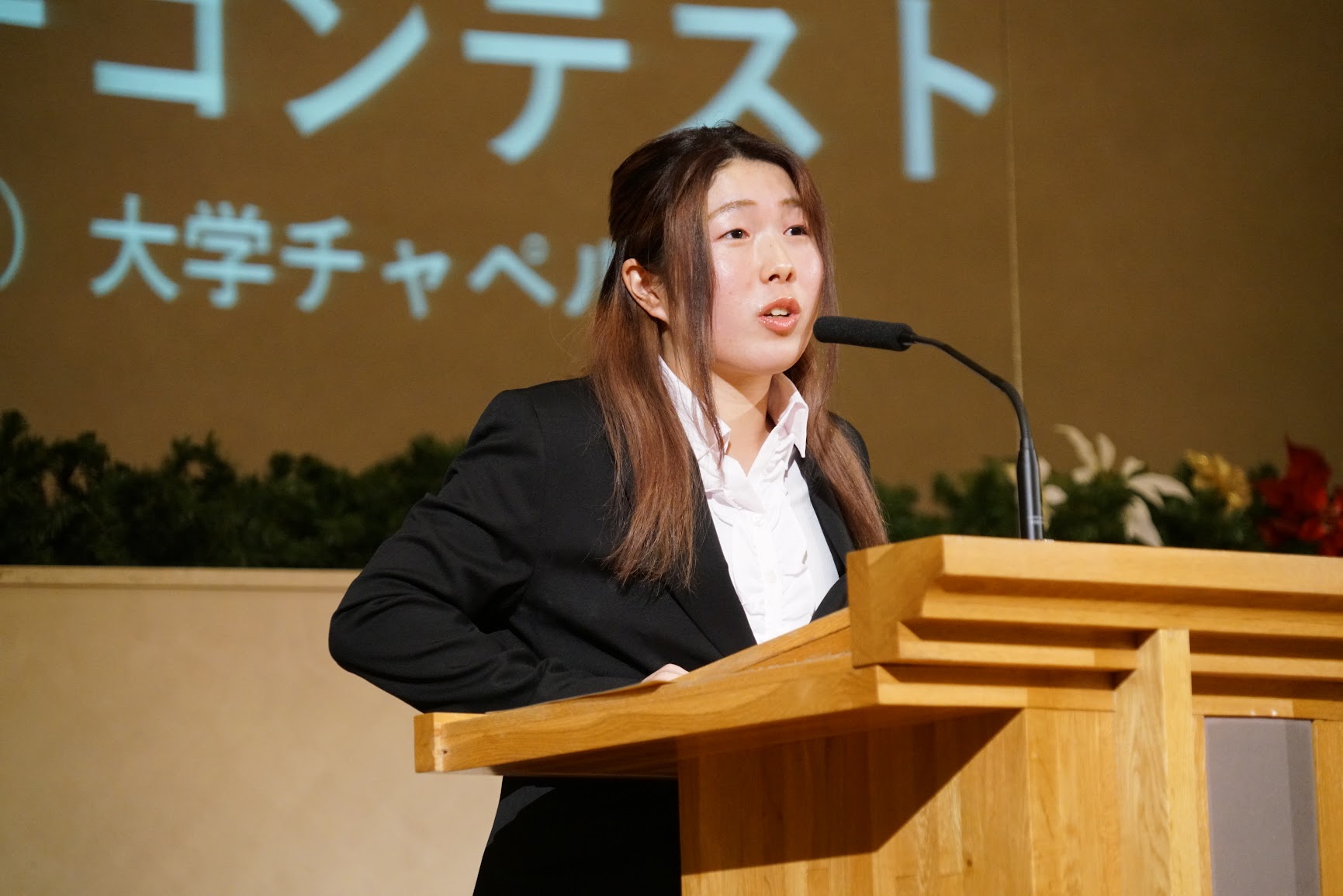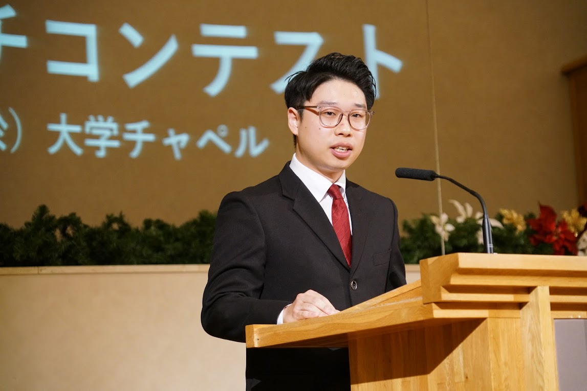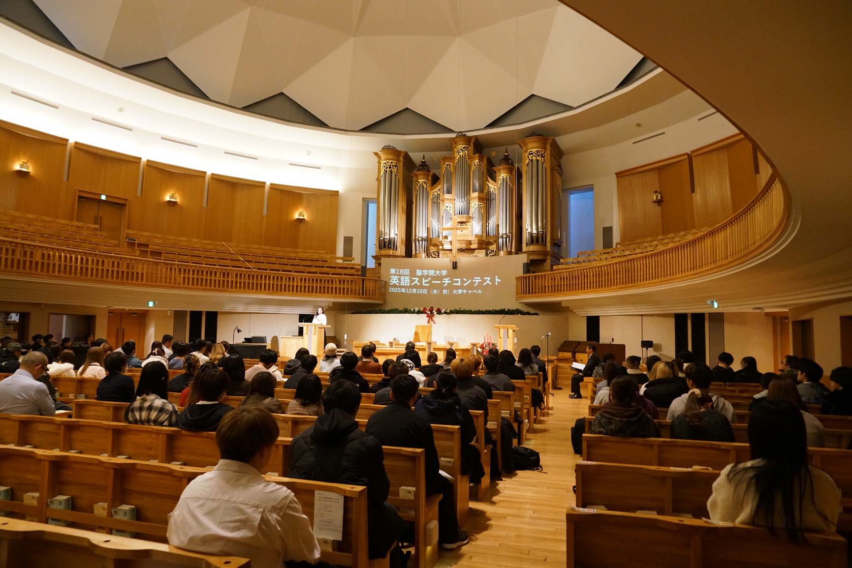 2025年12月10日(水)チャペルにて「2025年度 第18回 聖学院大学 英語スピーチコンテスト」を開催しました。英語スピーチコンテストは、聖学院大学の学生が英語によるスピーチを競うコンテストです。選ばれた5名の学生が熱弁をふるい、ボディーランゲージを交えながら伝えたい想いを聴衆に届けました。