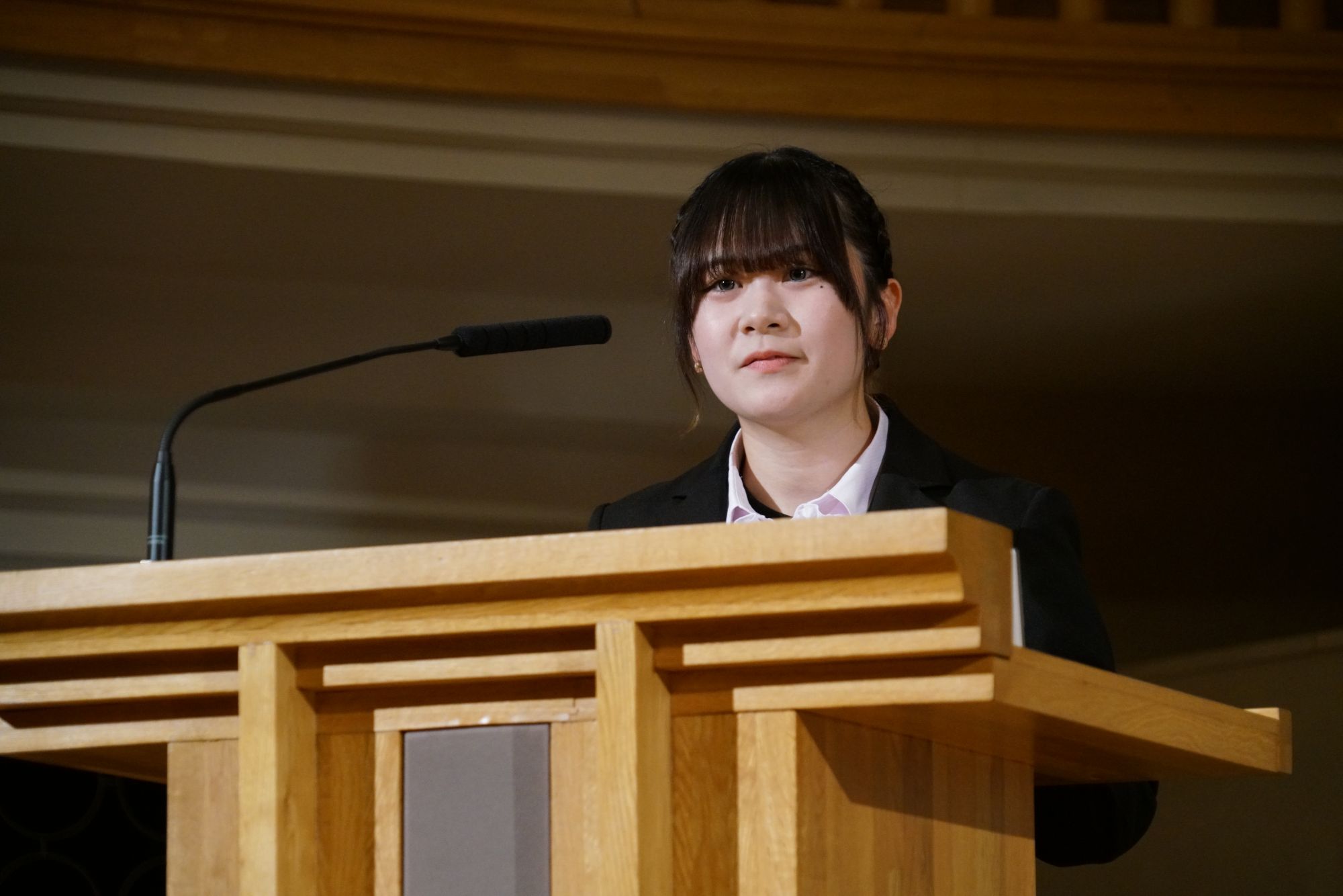 本日このチャペルで100人以上の観客の前でスピーチをするにあたって、母国語でない言語で原稿を書くのは大変な努力が必要だった事と思います。その意味で参加者全員が素晴らしかったと思います。