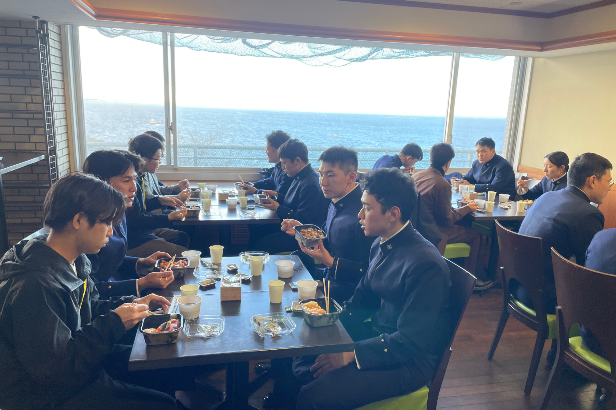 防衛大学校に到着すると、大学内にある海の見える食堂で、防大生と一緒に親交を深めながら昼食をとりました。