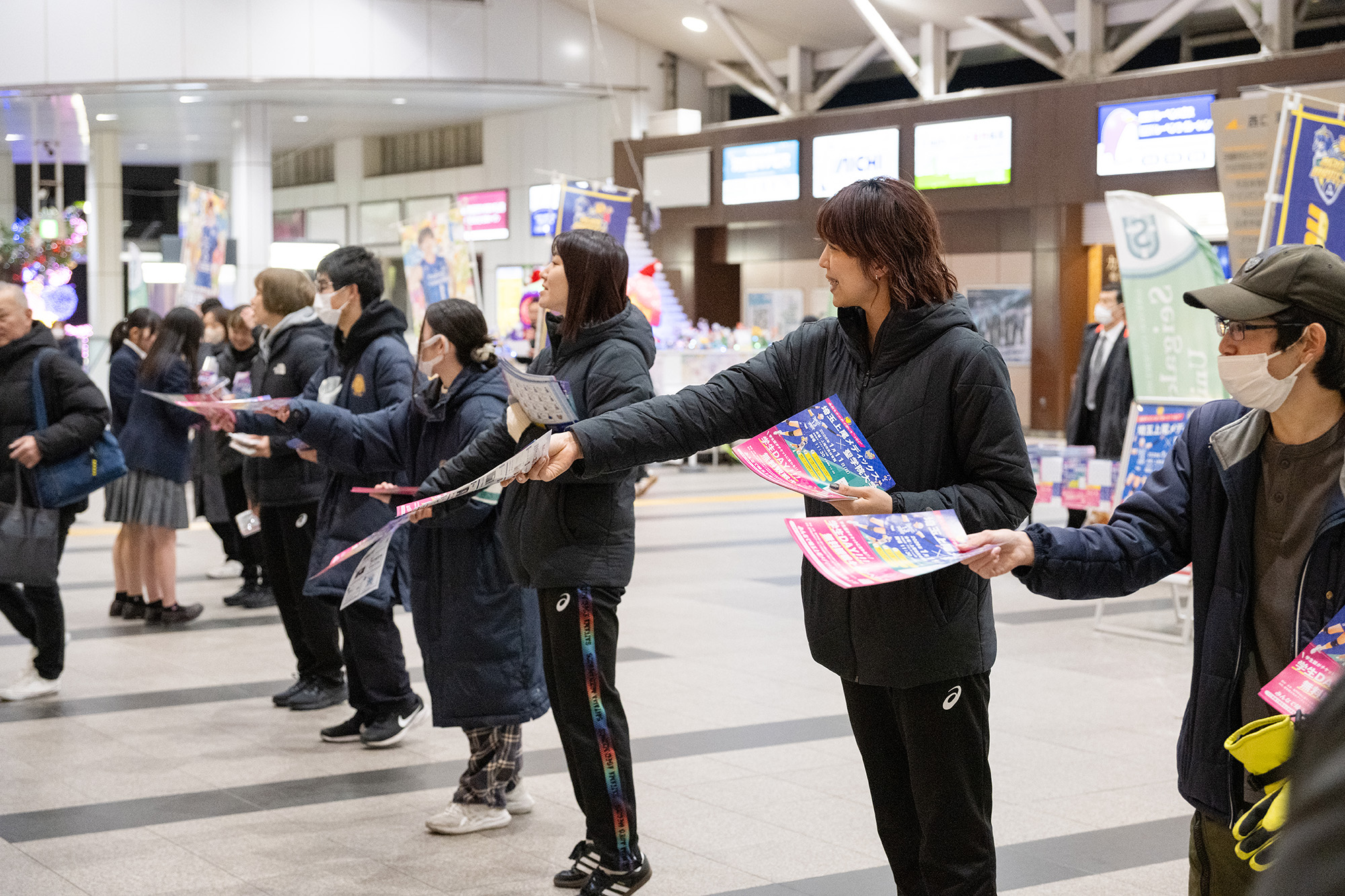 上尾駅改札口前〜コンコースで、学生が埼玉上尾メディックスの選手と一緒に、コラボイベントのPR活動