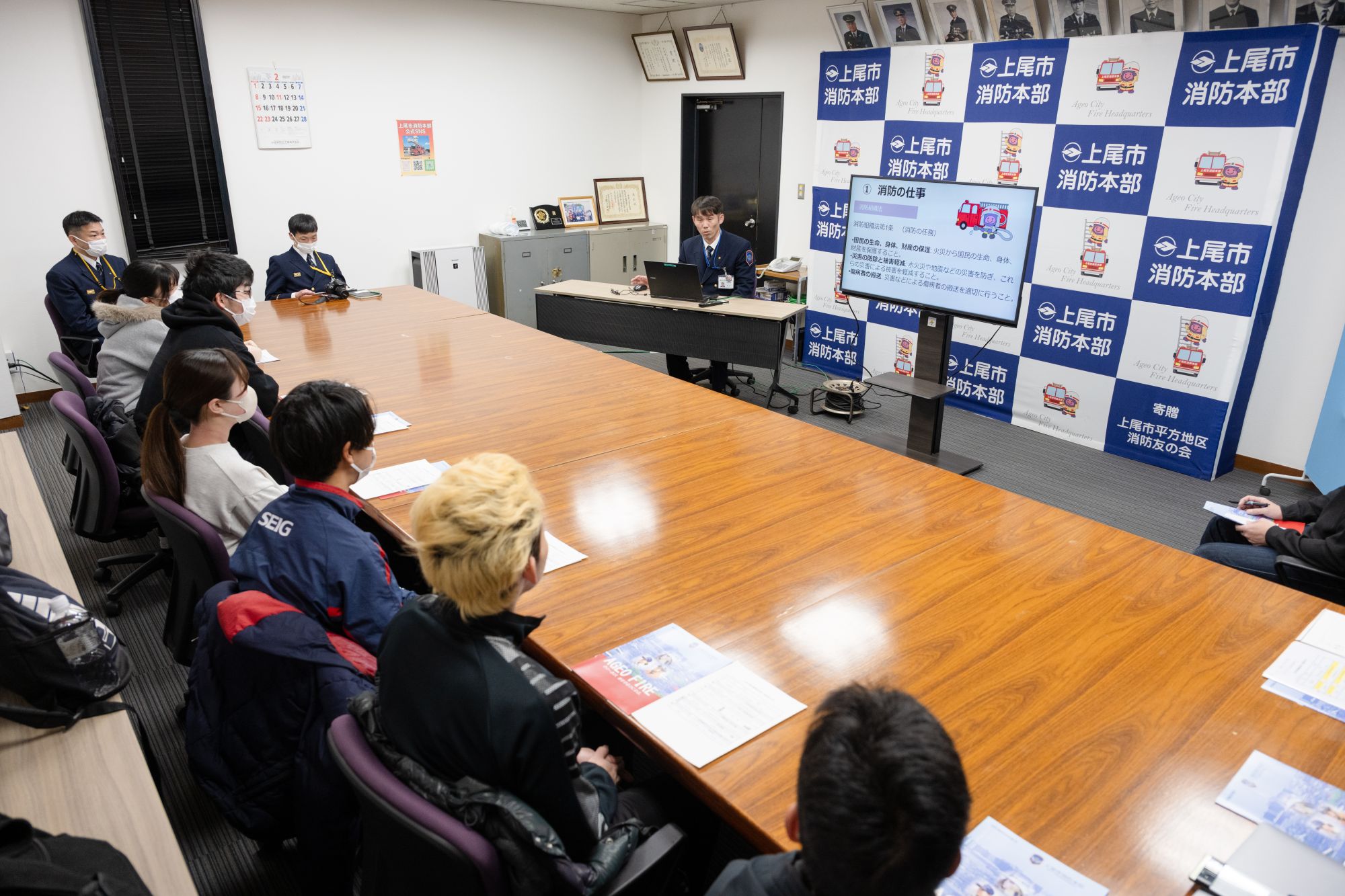 プログラム前半では、消防署職員の方から消防の仕事について説明を受けました。消防の任務は、火災の消火だけではありません。救急搬送、交通事故などの救助活動、119番通報を受ける指令業務、さらには火災を未然に防ぐ予防業務まで、多岐にわたります。