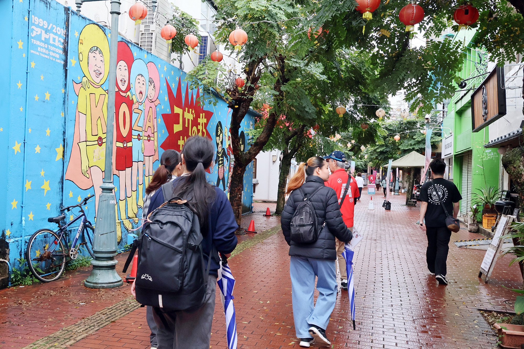 コザの街歩き。日本語と英語が入り混じる看板。戦後、基地と共に独自の発展を遂げた「ちゃんぷるー文化」を体感