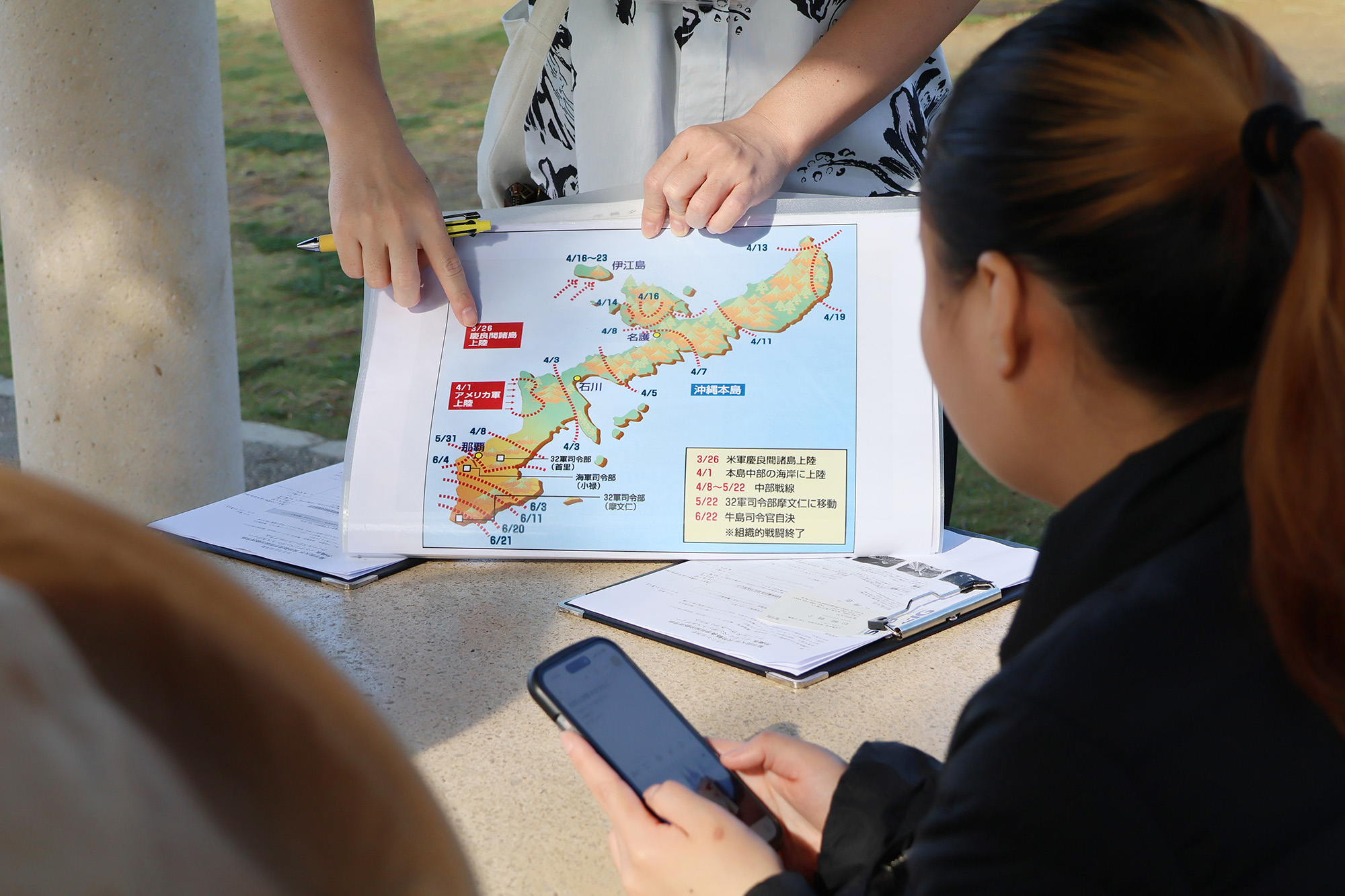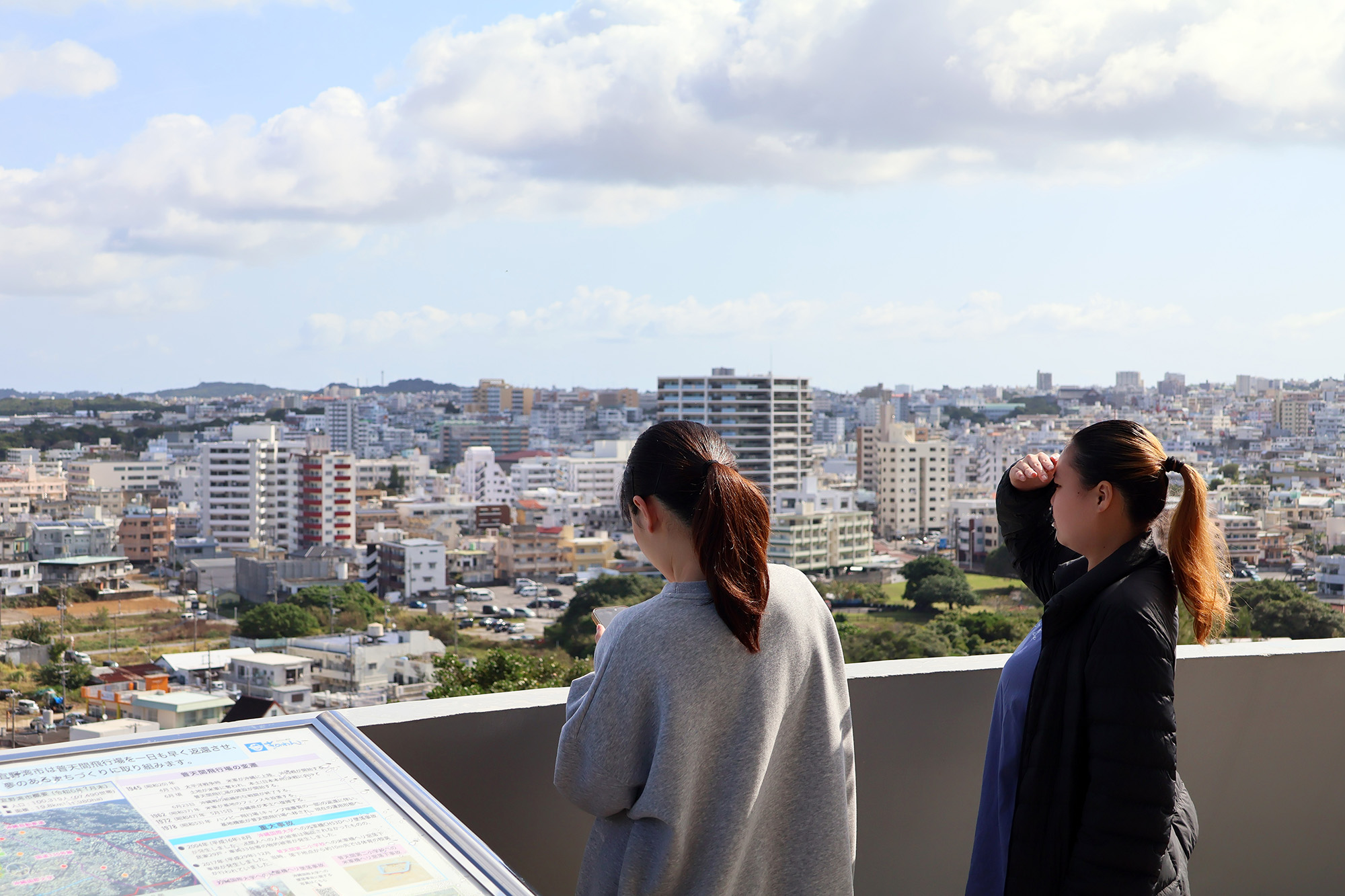 学生たちは、普天間基地を一望する嘉数高台で市街地との近さに言葉を失い 、一方で多文化が混ざり合うコザの商店街では、異なる背景を持つ人々が共生するための細かな工夫を発見しました。