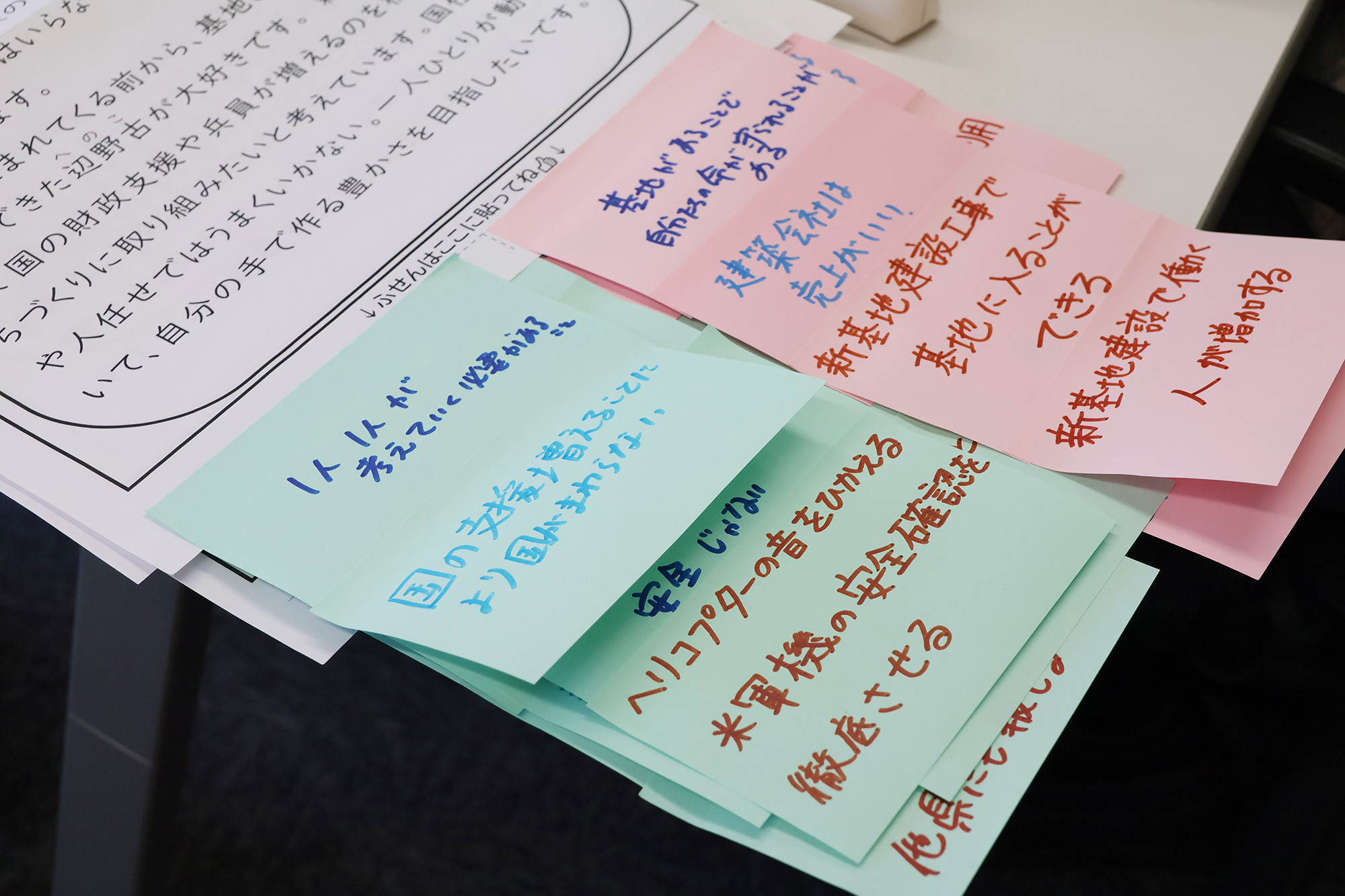 「住民の声カードワーク」として、基地があることによる課題とメリットを書き出していきました