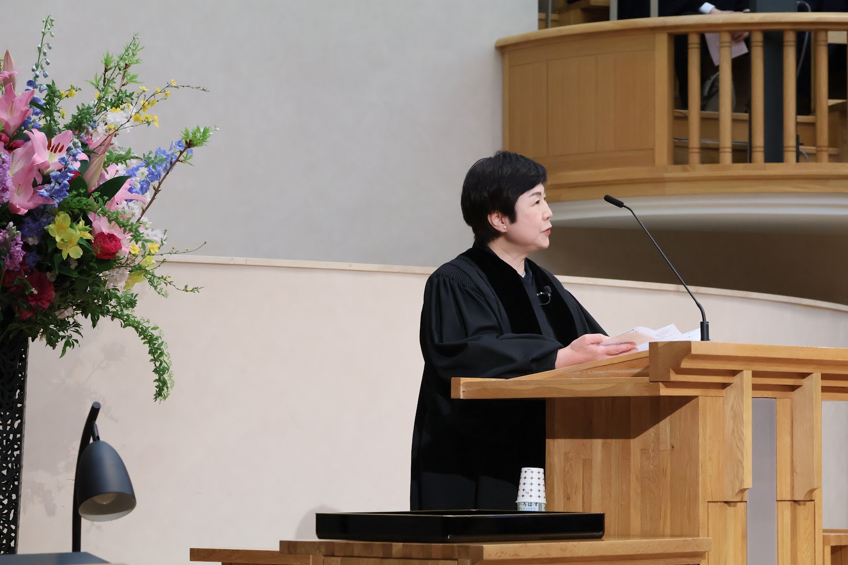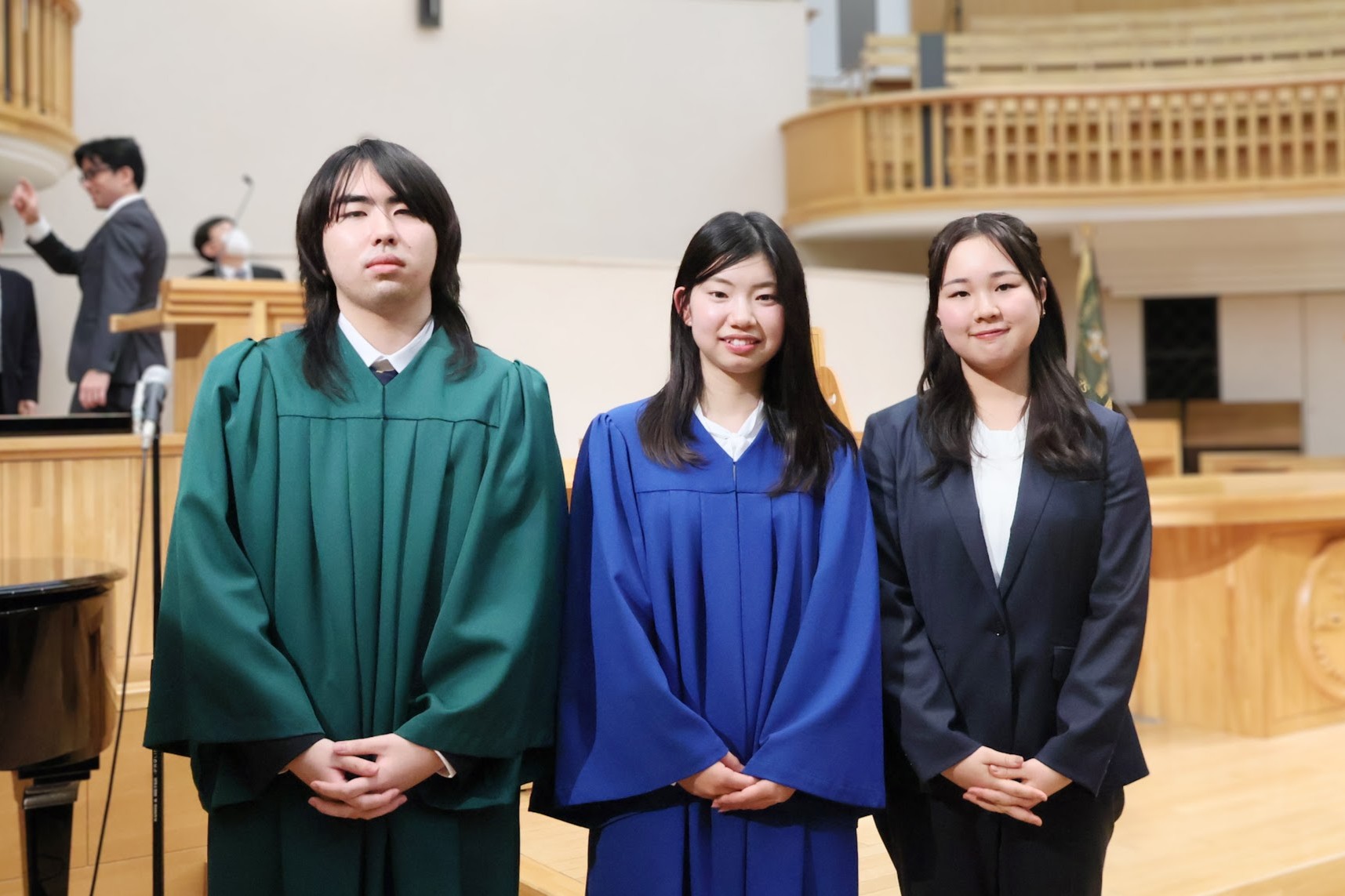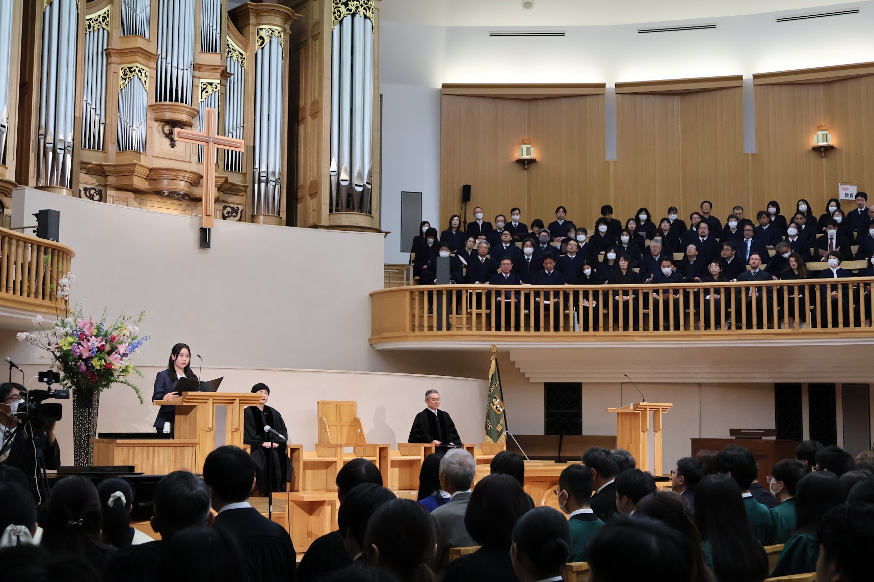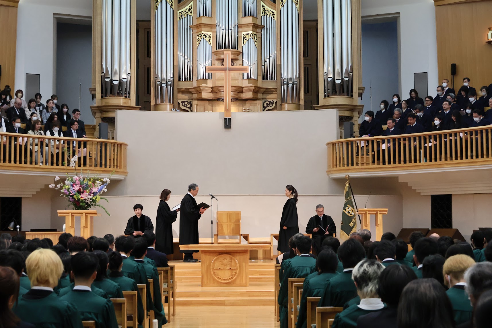 聖学院大学の入学式は、チャペルでの礼拝形式で行われます。新入生は、政治経済学部のダークグリーン、人文学部のロイヤルブルー、心理福祉学部のワインレッドと、スクールカラーのアカデミックガウンを着用。今年度は、大学の教育活動を精神的に支える「チャプレン」の任職式も併せて行われ、学問と人間形成が地続きであることを改めて示す機会となりました。聖歌隊の澄んだ歌声やハンドベル・クワイアの軽やかな音色に包まれ、参列した家族や在学生も、新入生の晴れの日を温かく見守りました。