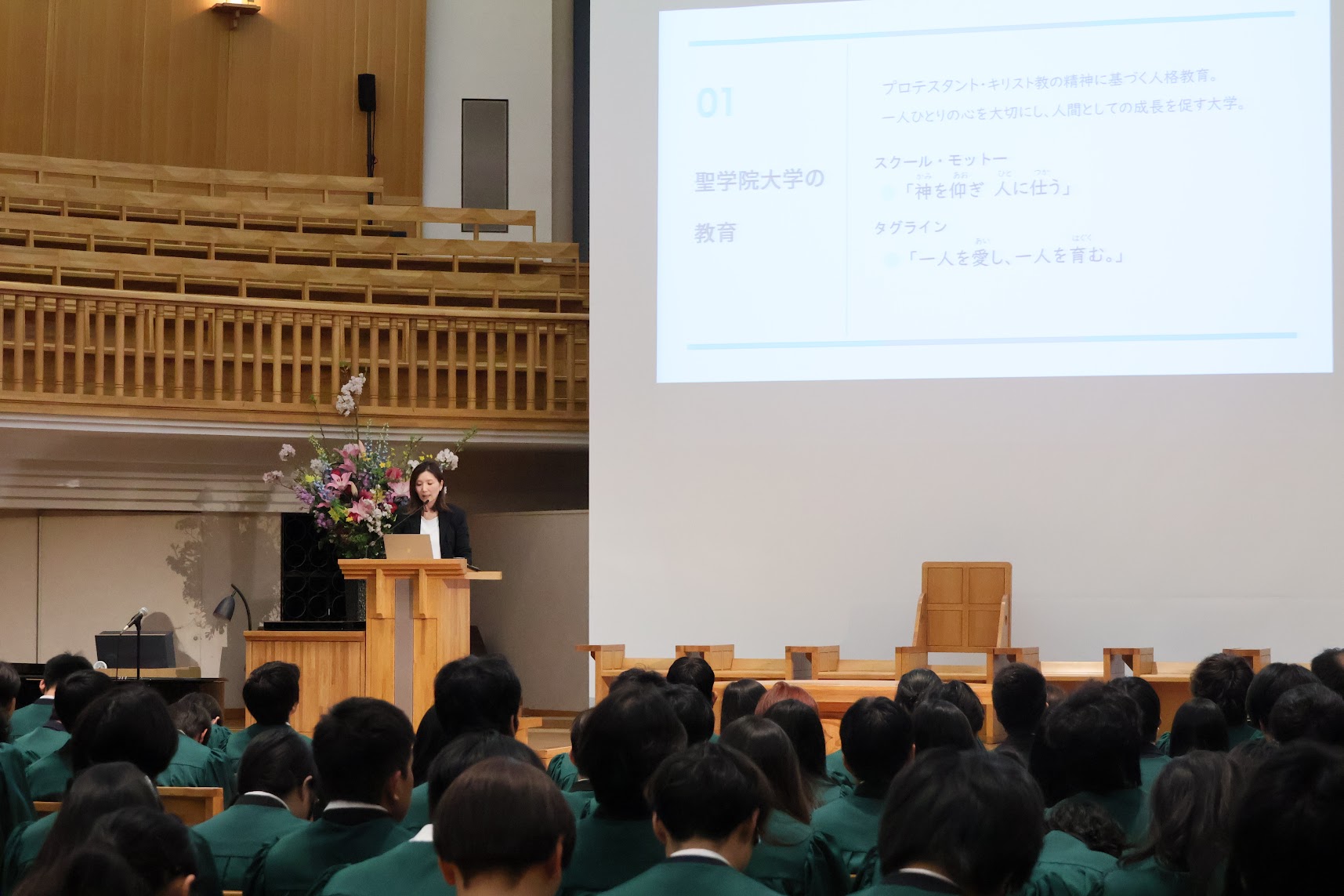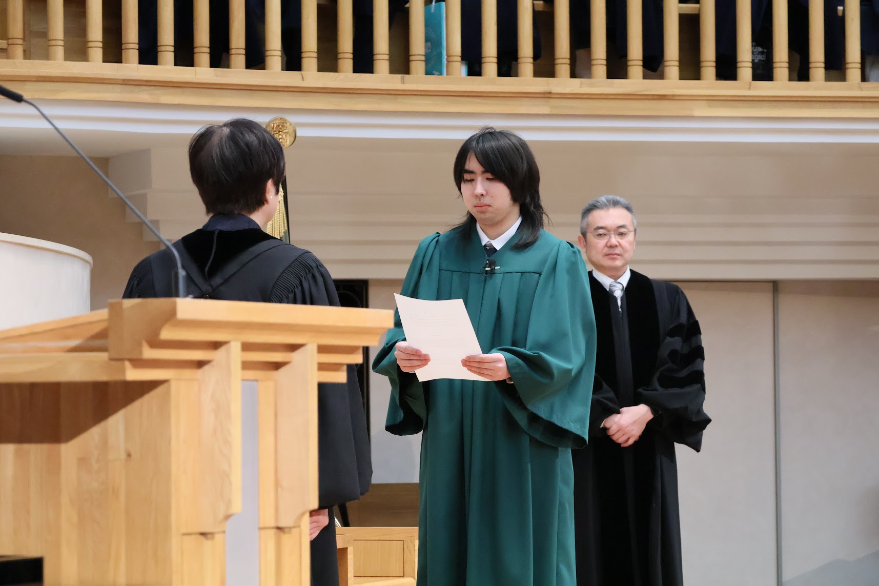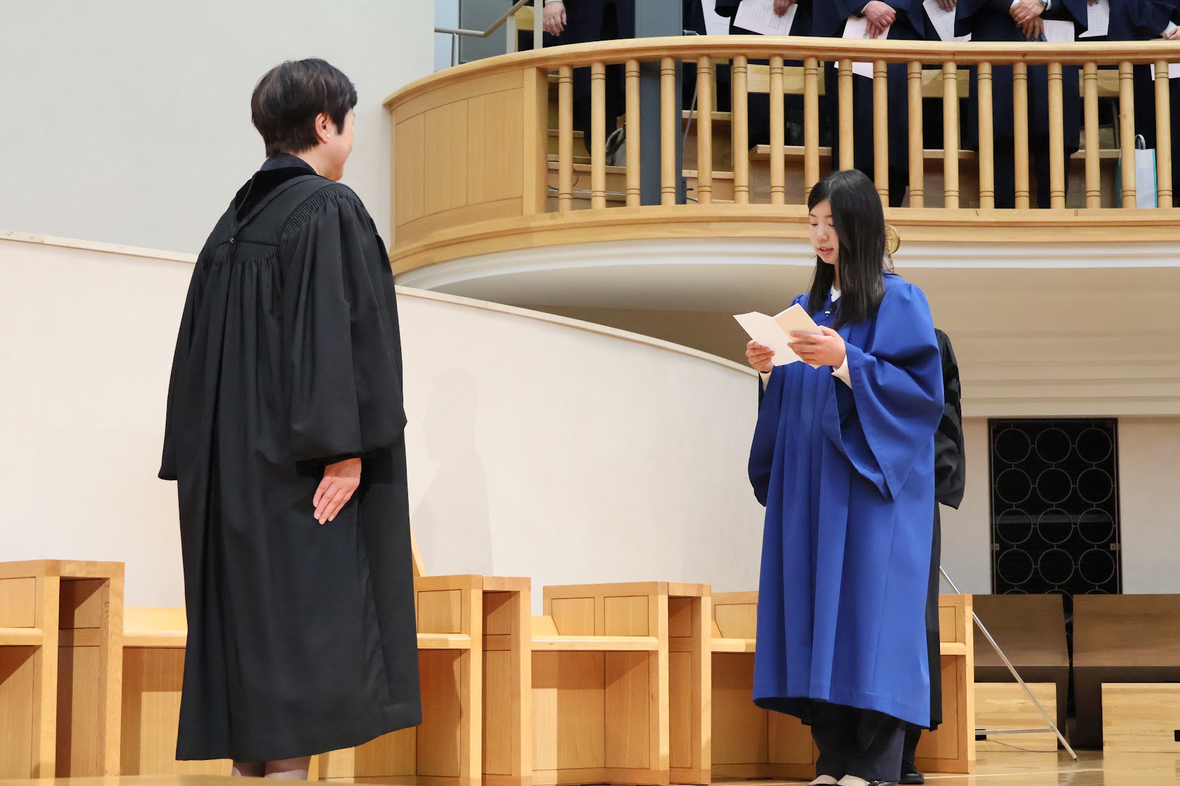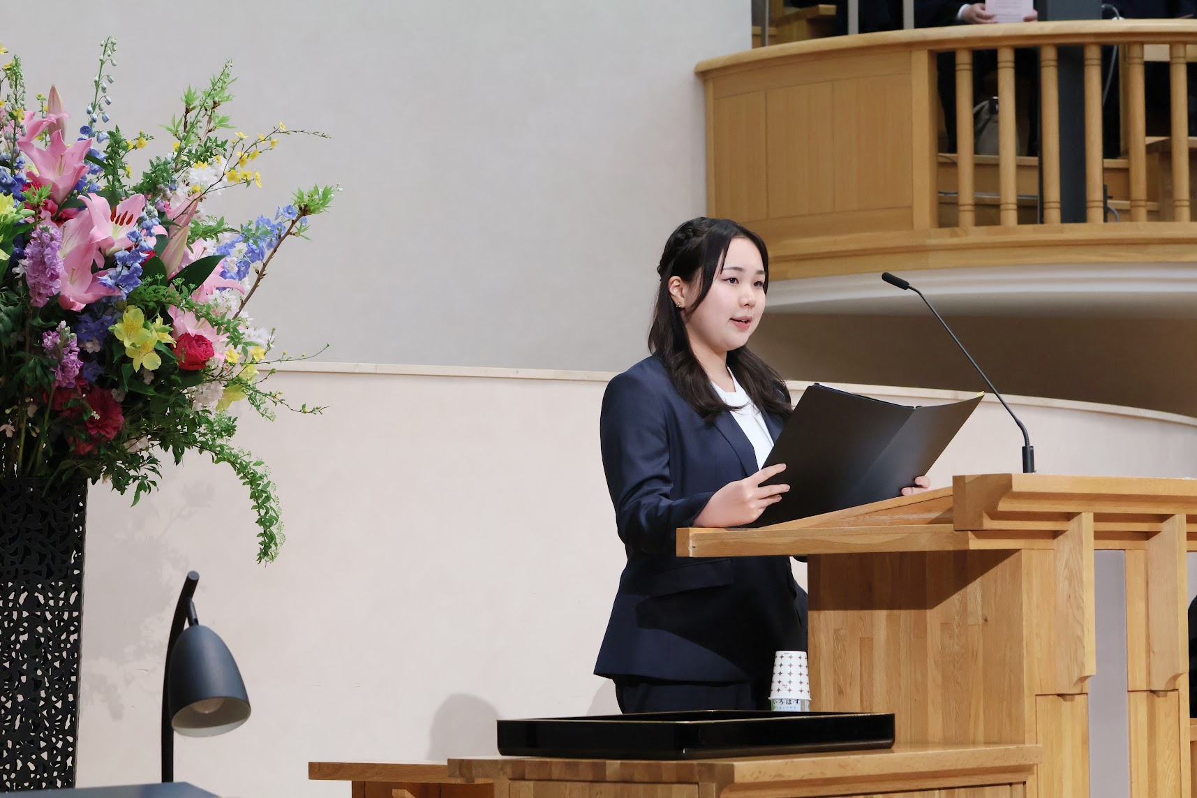 新入生代表の政治経済学科・小林さんは「学業への研鑽、平和への貢献、隣人への愛と人格形成に努めることを誓います」と宣誓。国際文化学科・山﨑さんは自身の経験に触れ、「異なる背景を持つ人々と出会う中で、言語を学ぶことの大切さや自分の思いを相手に伝えることの重要さを実感した。これからは国際文化学科での学びを通じ、変化を恐れず多くの人とつながり自分の世界を広げ、周囲の人と共に成長できる道を模索したい」と力強く語りました。また、在学生代表の川村さんは「悩むことも、立ち止まることもあるはず。でも、ここには共に悩み、支えてくれる仲間や教職員がいます。安心して挑戦してください」と、実体験に基づいたエールを贈り、会場は一体感に包まれました。